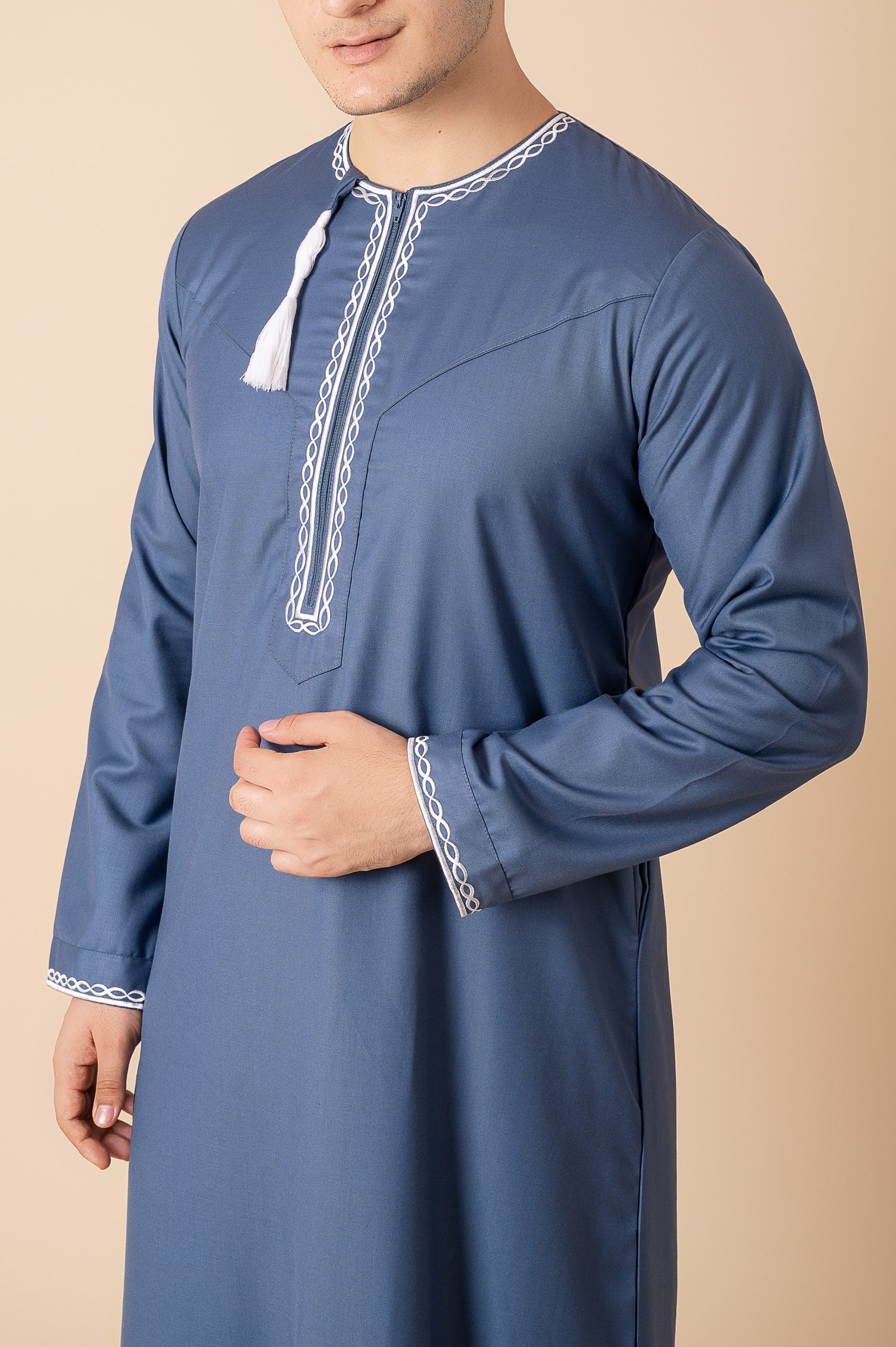 A refined steel blue Omani thobe highlighted with white loop embroidery and a classic tassel.