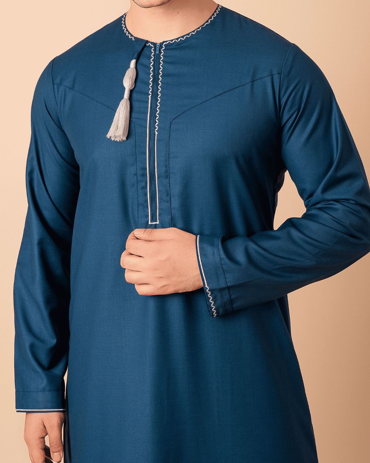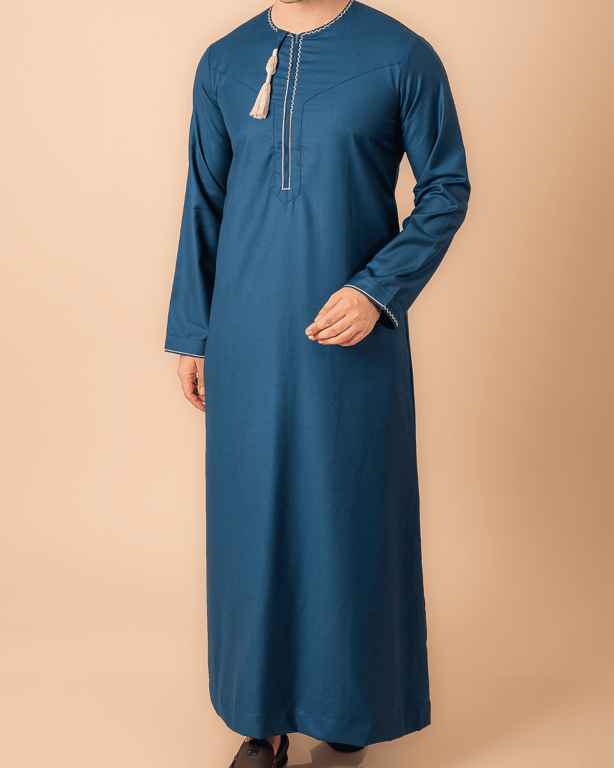 This refined teal blue Omani thobe is accented with traditional white geometric embroidery along the placket, neckline, and cuffs for a timeless Gulf look. Finished with an authentic Omani tassel and modest full-length fit, it is ideal for prayers, Eid, and formal occasions.