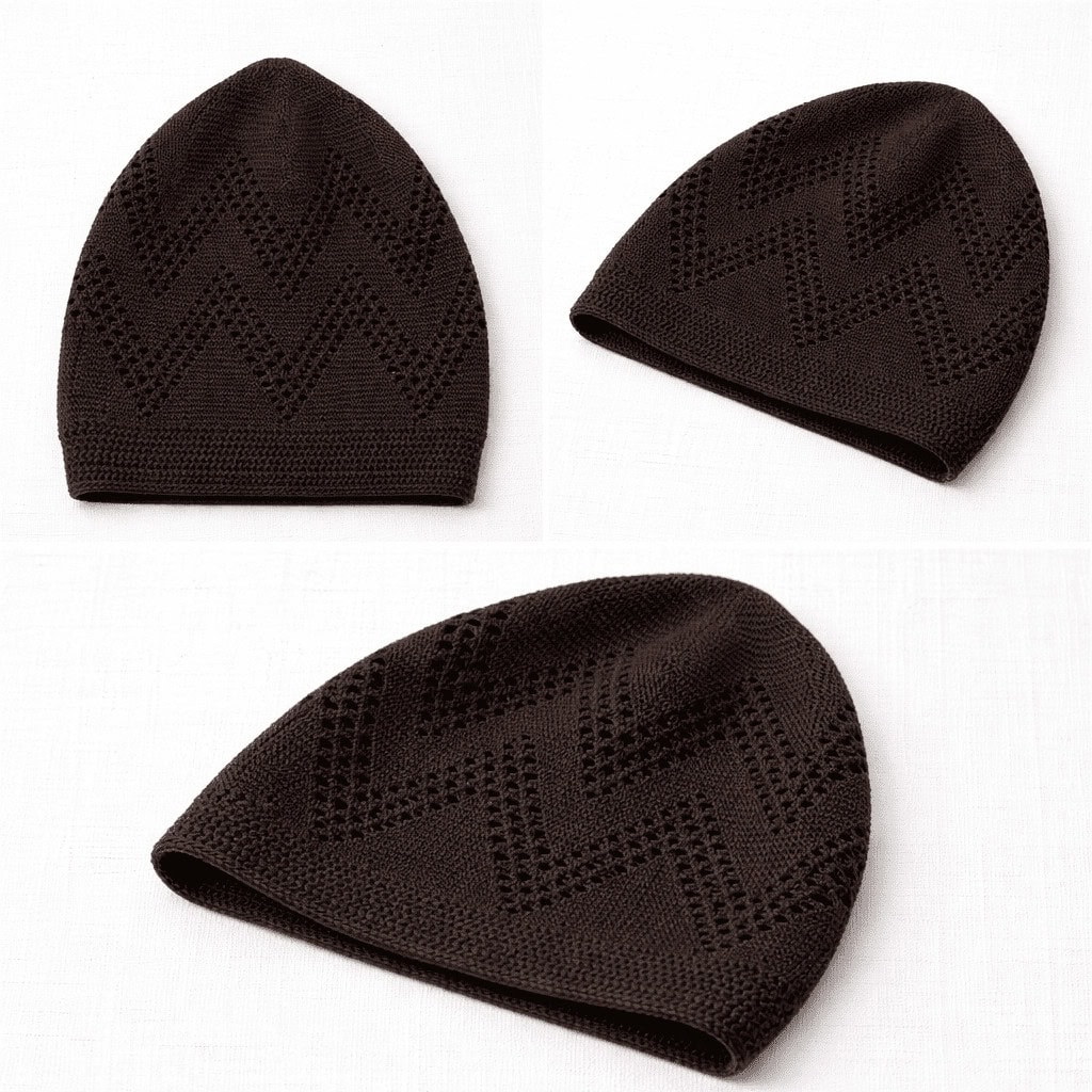 Turkey Sufi Knitted Prayer Cap for Men – Dark Brown Islamic Kufi with Geometric Open-Work Design