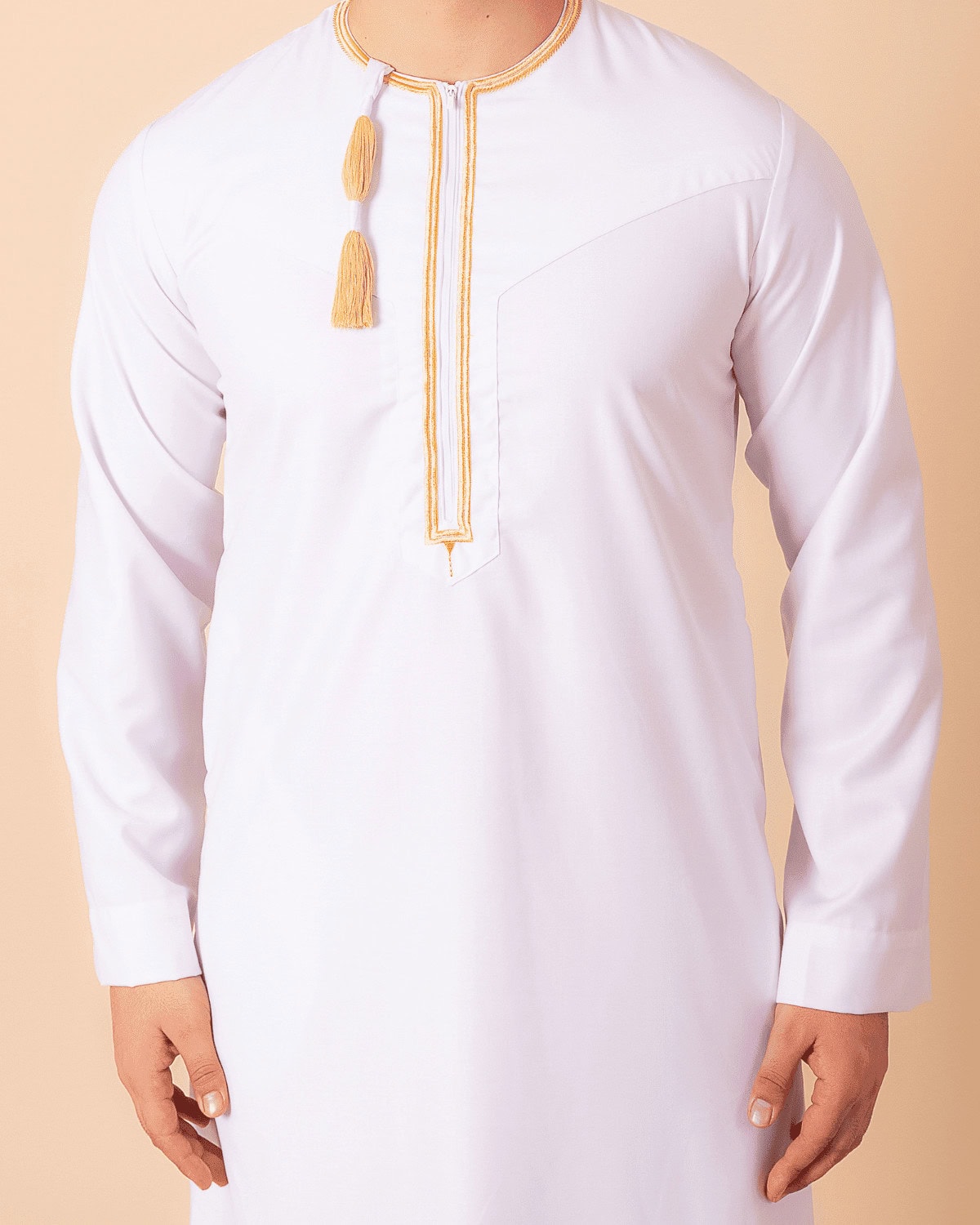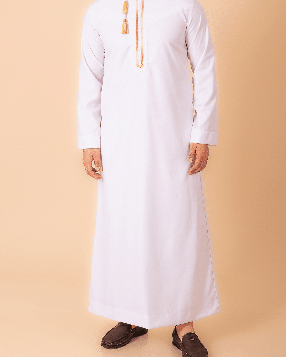 A classic white Omani thobe highlighted with refined golden embroidery and a traditional tassel.