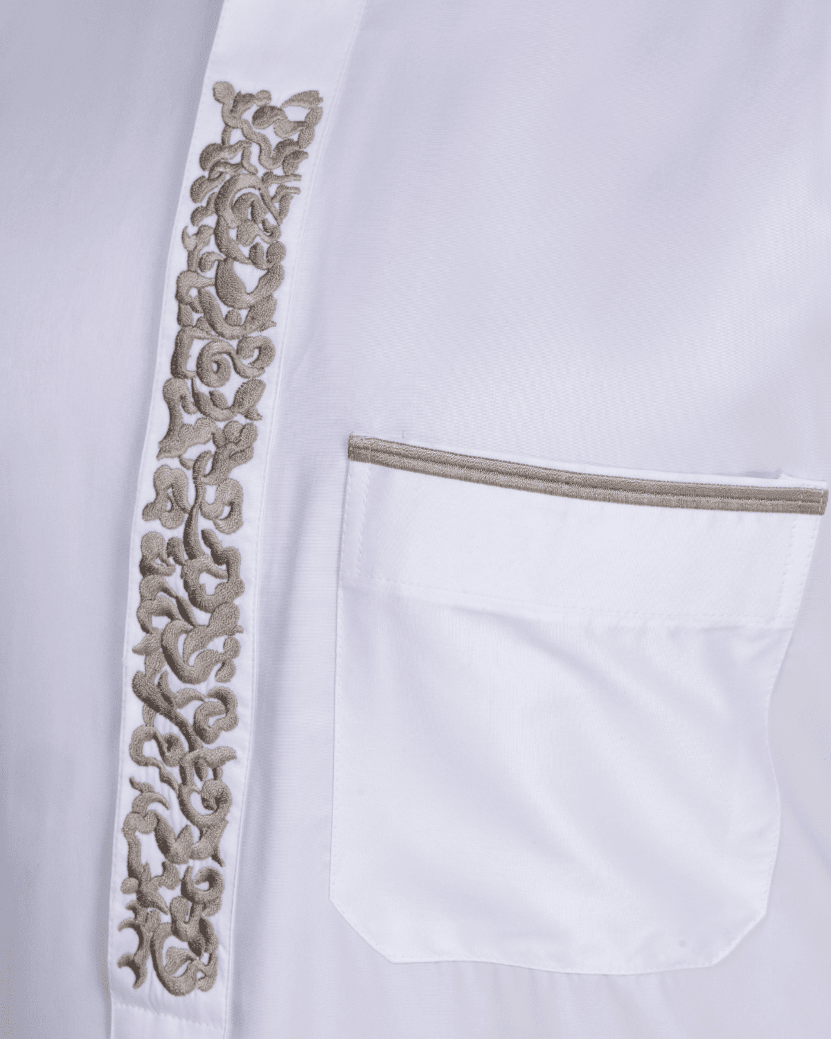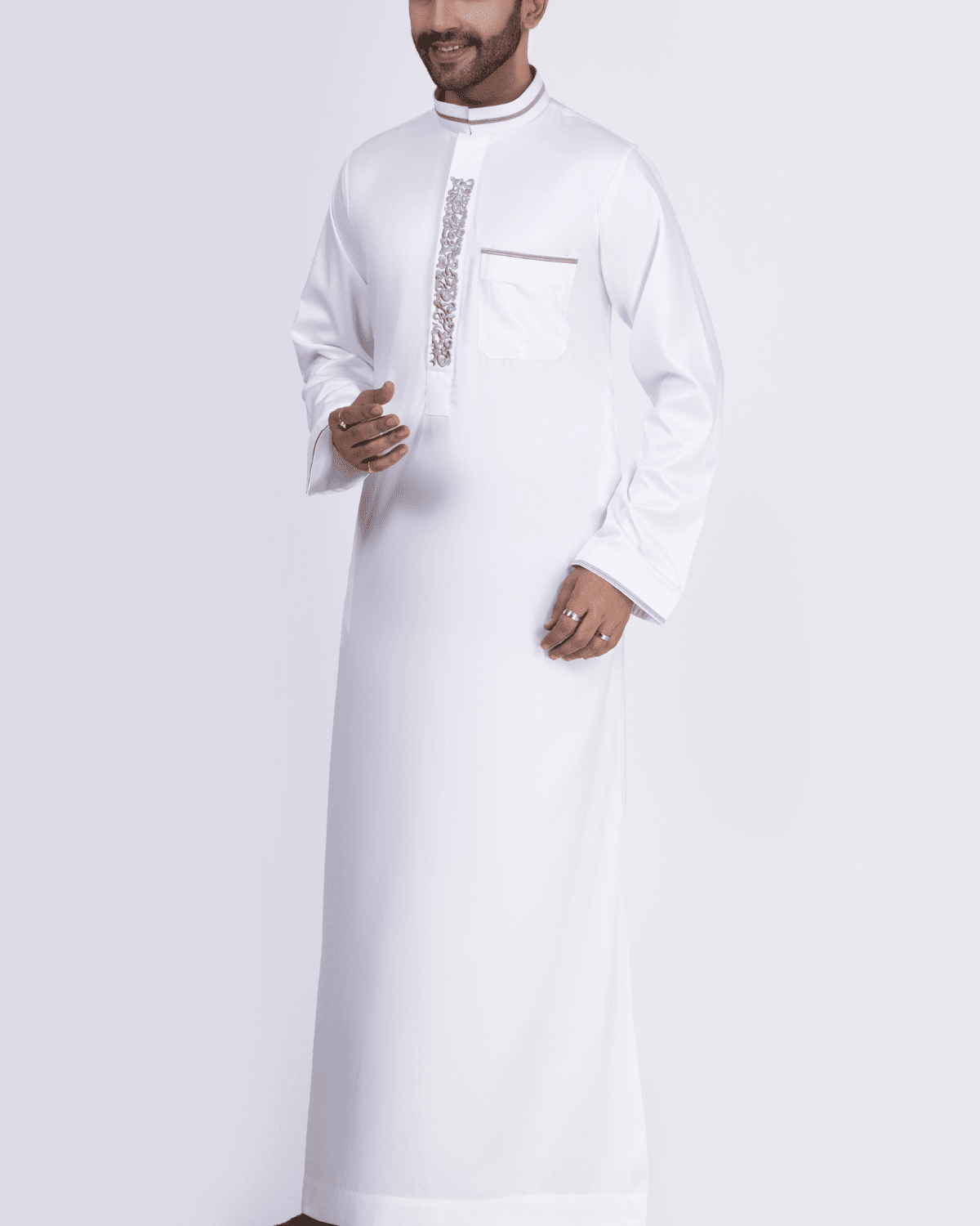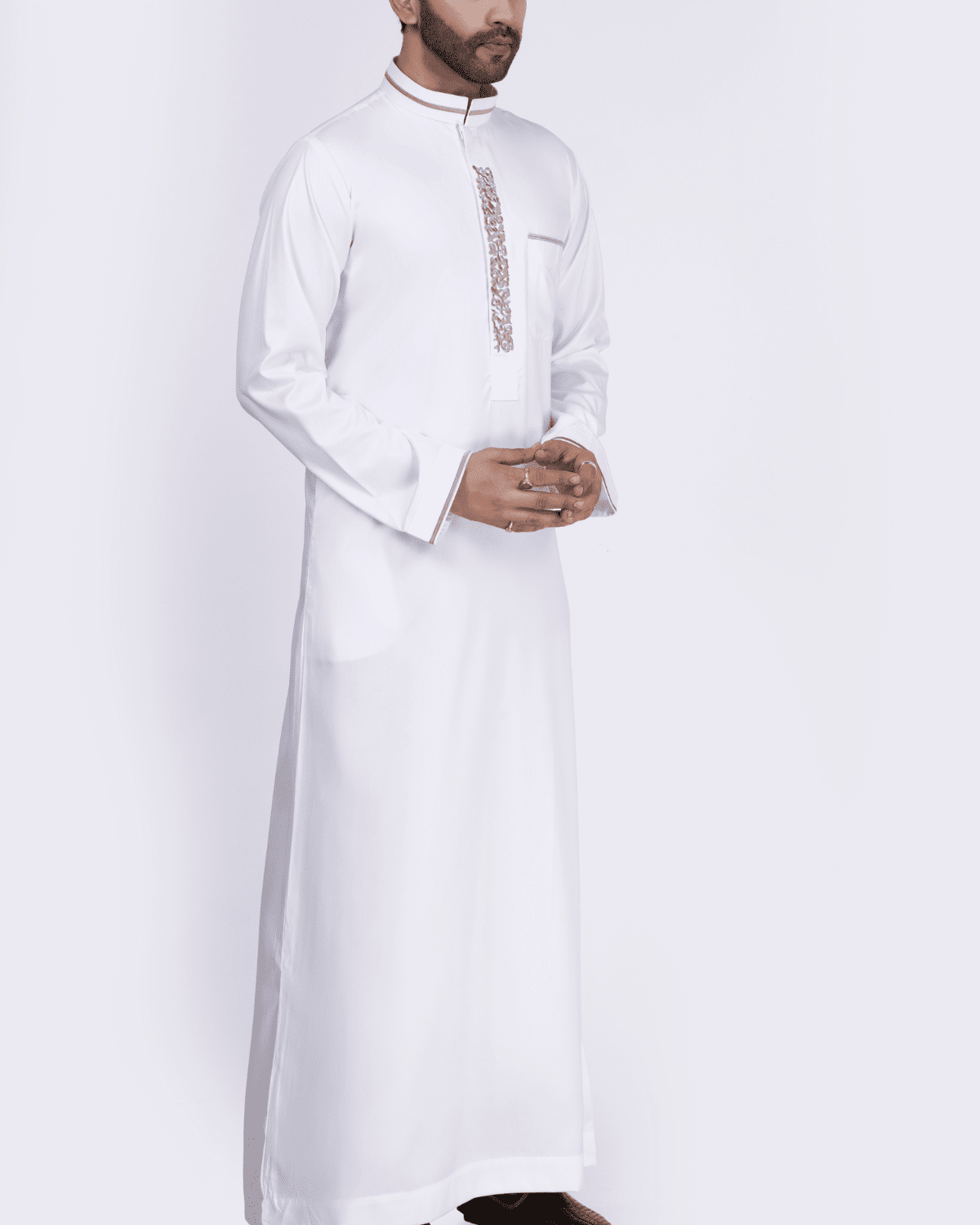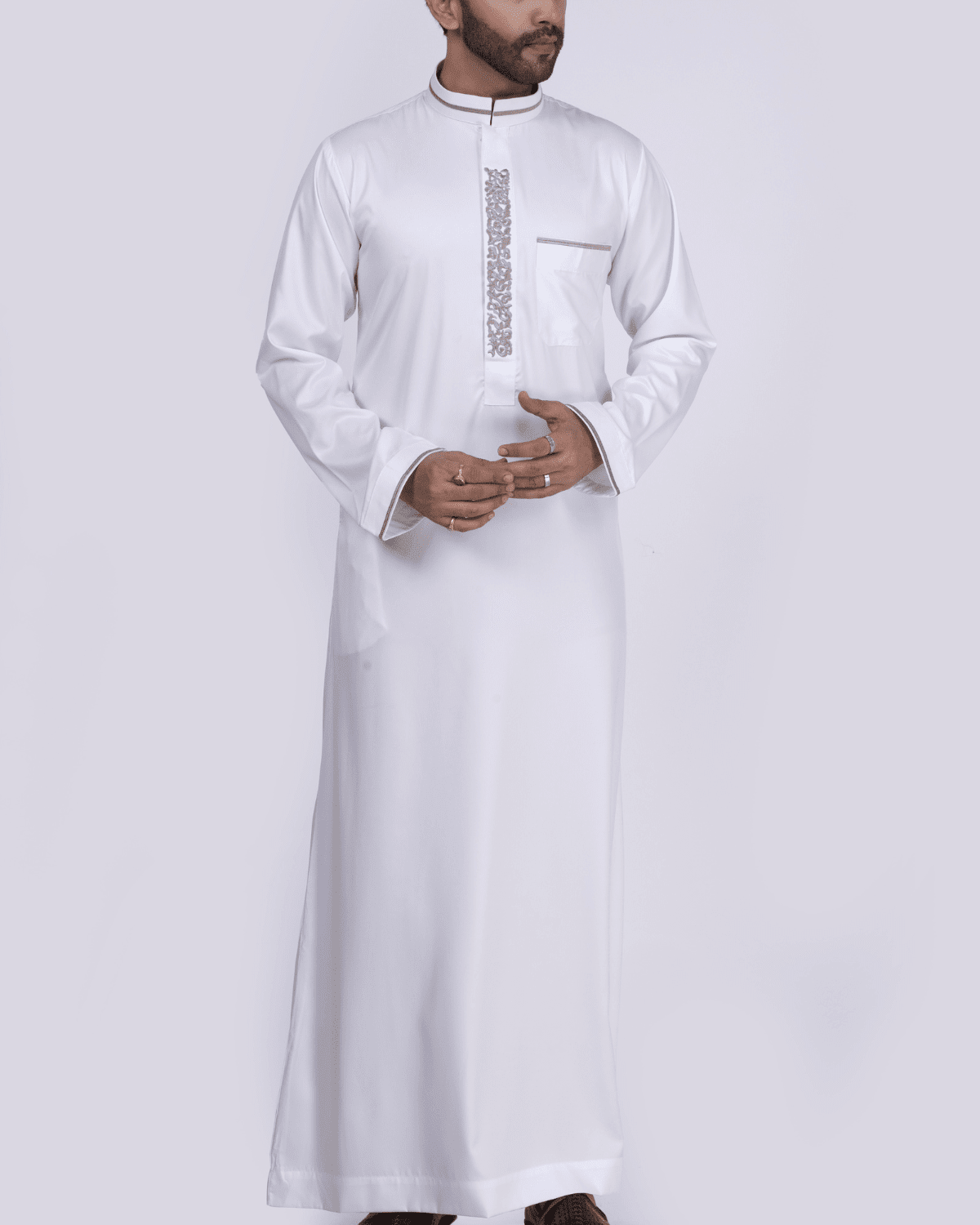 This premium white thobe showcases a beautifully crafted vertical floral embroidery strip in a soft beige tone, adding subtle luxury to its classic design. Finished with a band collar, piped cuffs, and chest pocket trim, it is perfect for prayers, Eid, and formal Islamic occasions.